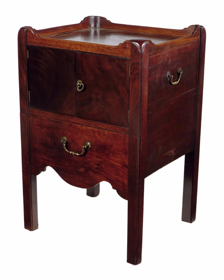 A George III mahogany tray-top bedside commode, with brass side carrying handles, with a pair of cupboard doors above a converted pull-out base, 77.5cm high, 50.5cm wide, 45.5cm deep.