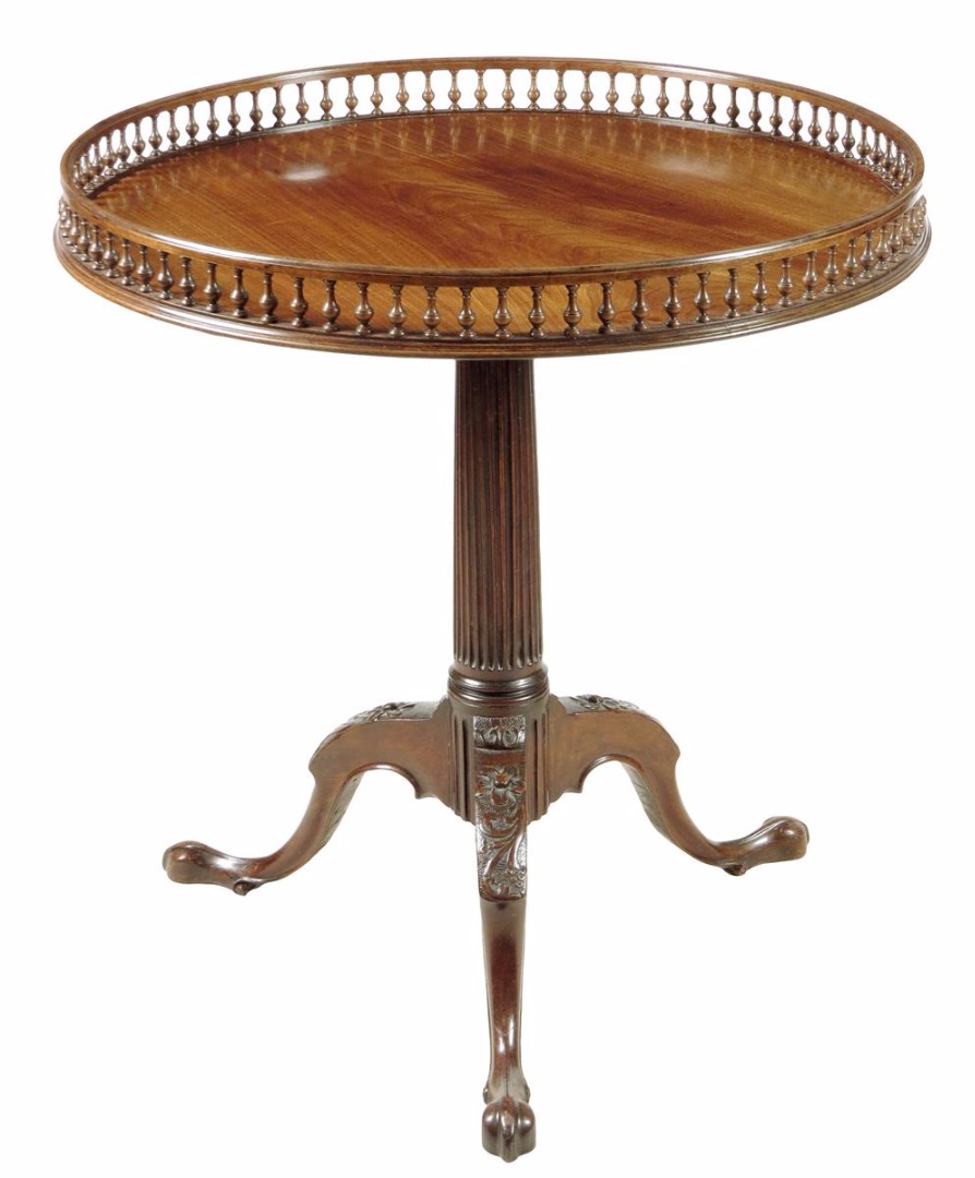 An early George III mahogany tripod table, the circular tilt-top with a balustraded gallery, above a fluted stem and leaf and flower carved legs terminating in stylised claw and ball feet, 70.7cm high, 67.5cm diameter.