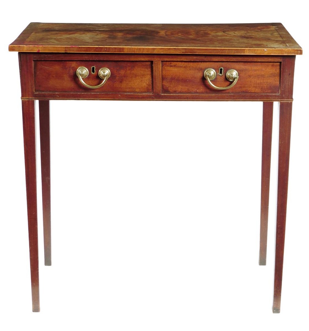 A George III mahogany side table, inlaid with stringing, the crossbanded top above twin frieze drawers on square tapering legs, the back with a trade label for 'Norman Adams, 78cm high, 76.7cm wide, 45.5cm deep.