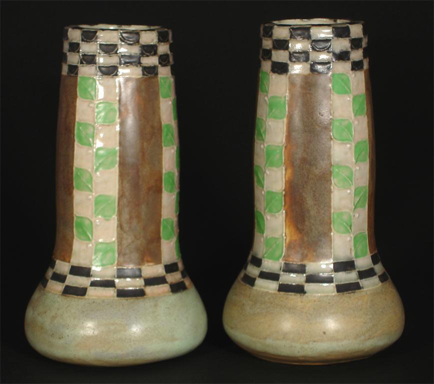 A pair of Royal Doulton Late Edition stoneware vases by William Row, tapering cylindrical form with foliate columns flanked by chequer board design, in colours impressed marks 23cm. high