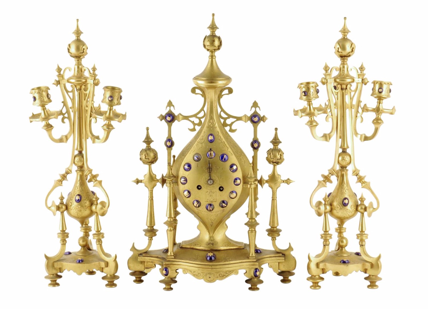 A late 19th century ormolu clock garniture, the eight day movement striking on a bell, the backplate signed with initials 'H F' and 'Cie Paris', stamped '128', with a blue enamel dial with Roman numerals engraved with a coronet and a cypher 'DSD', and 'LONDON & RYDER 17 NEW BOND STREET', the tear drop shape Gothic style skeleton case applied with blue enamel and gilt cabouchons, 44cm high, 27cm wide, together with a pair of matching three light candelabra. (3)