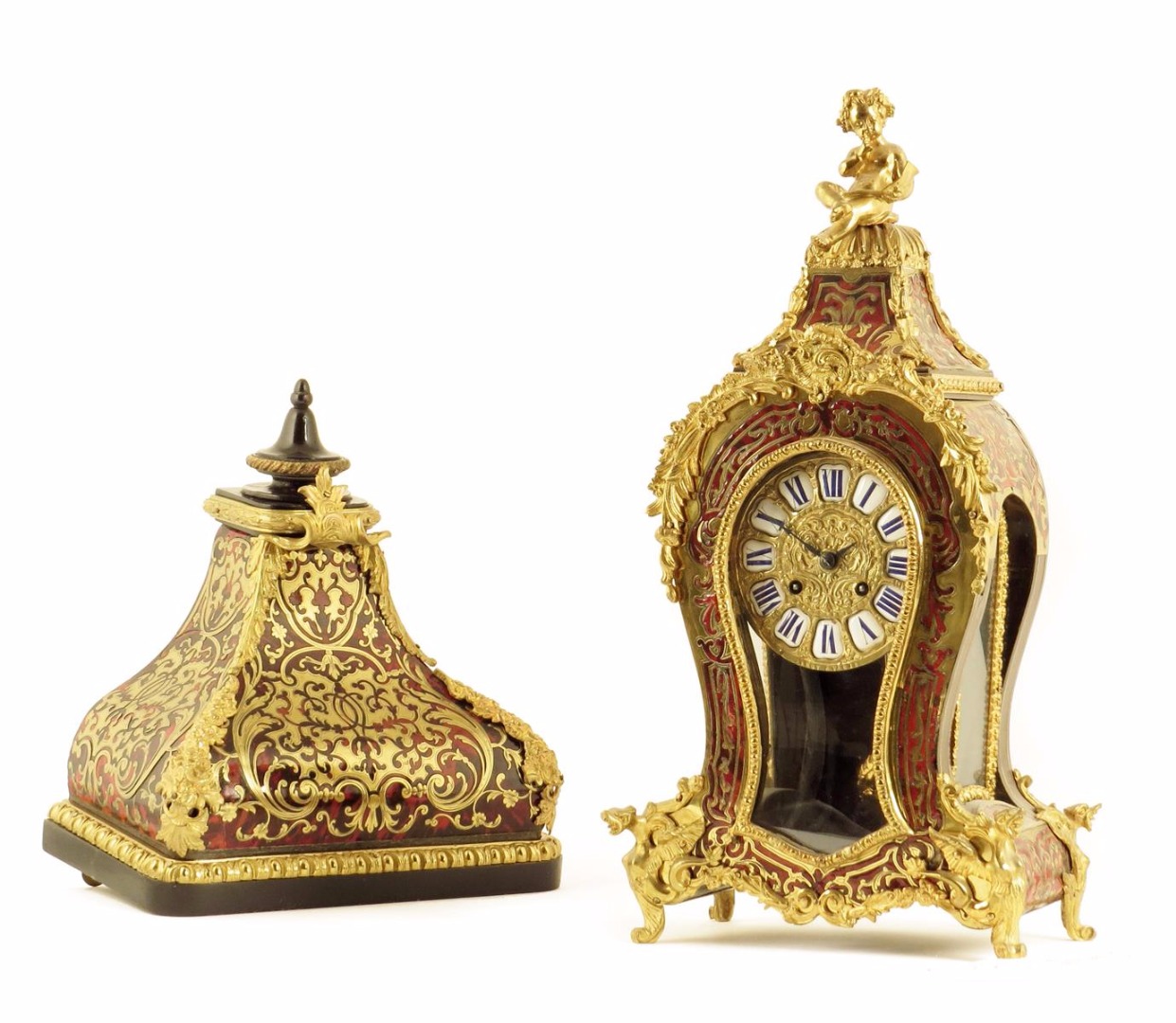 λ A late 19th century French brass and tortoiseshell boulle marquetry mantel clock