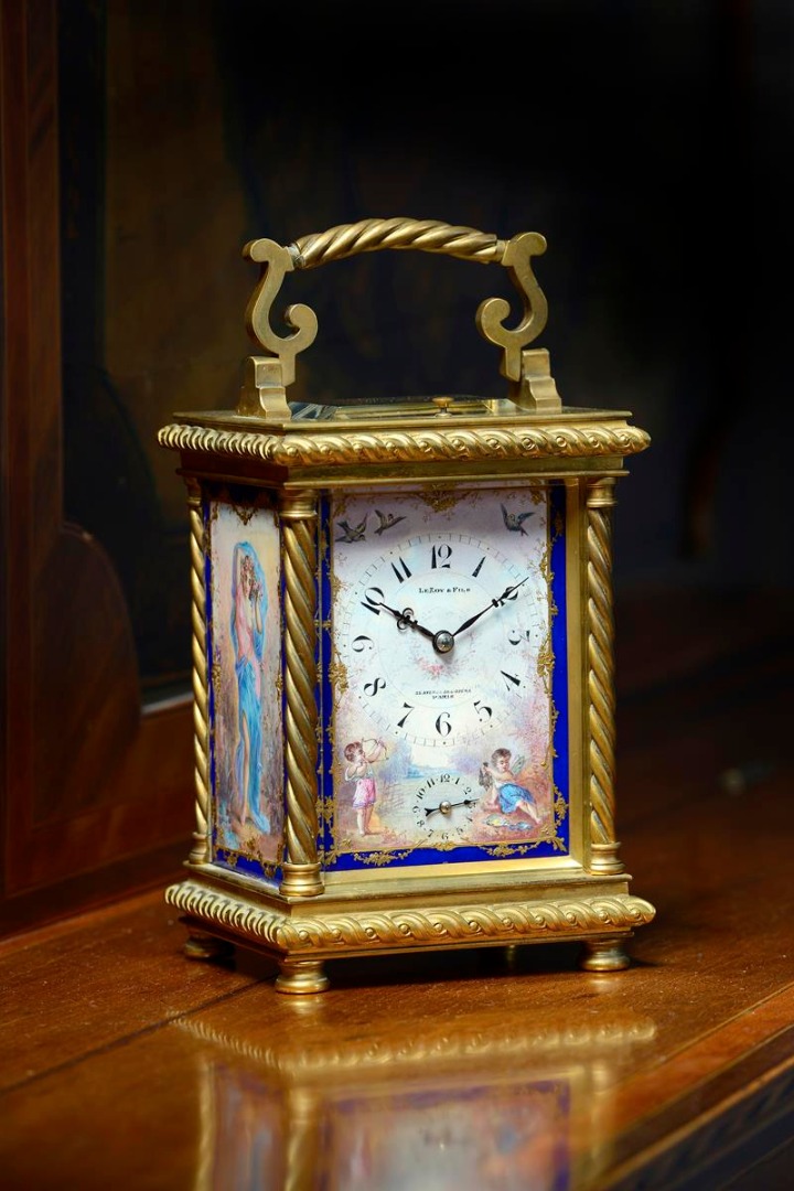 A late 19th century French gilt brass and enamel repeating carriage clock with alarm by Le Roys & Fils, the platform lever escapement striking on a gong, the backplate stamped '97', the painted enamel dial decorated with cherubs in a river landscape with love birds, the two dials with Arabic numerals, inscribed 'Le Roy & Fils, 35 AVENUE DEL'OPERA, PARIS', the sides painted with scantily clad classical maidens, in a guilloche decorated case with spiral twist columns, 15.3cm high, 10cm wide.