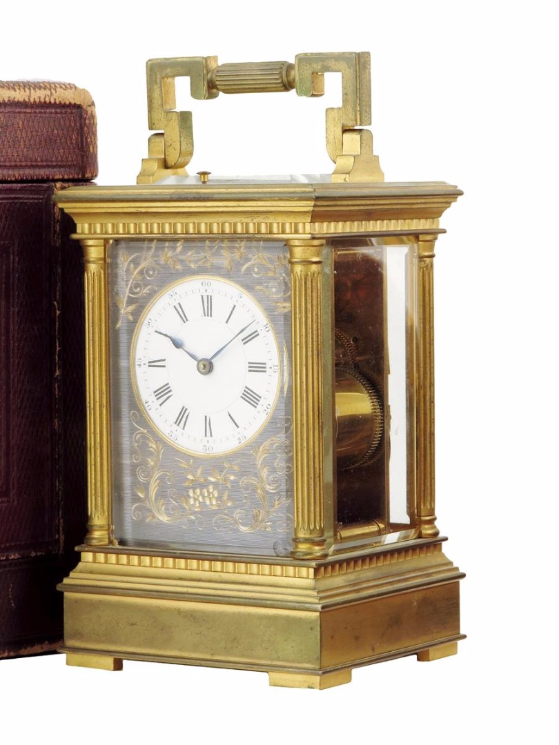A late 19th century French gilt brass grand sonnerie carriage clock by Henri Jacot, with repeat, the platform lever escapement striking on two gongs, the backplate with Jacot's parrot stamp and numbers '7623', the base with selector lever for 'Full Striking, Silent, Quarters', the white enamel dial with Roman and Arabic numerals with an engine turned surround engraved with gilt leaves, in an architectural case, 17.5cm high, with its leather travelling case. (2)