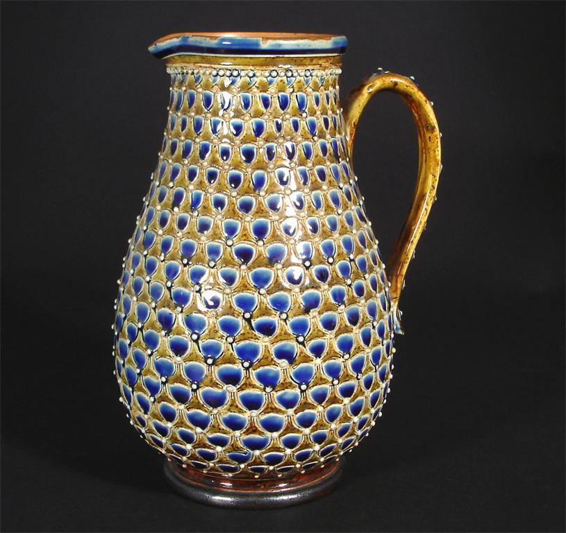 A Doulton Lambeth stoneware jug incised and applied with a geometric repeat in shades of blue and...