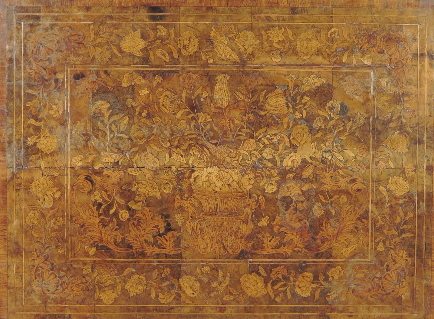A Dutch walnut and marquetry centre table, the detachable chevron banded top inlaid with a central urn of flowers with birds and angels within an outer floral and shell band, the conforming base with a frieze drawer on scroll legs united by an 'X' stretcher, late 18th / early 19th century, 70.8cm high, 107.3cm wide, 81cm deep.