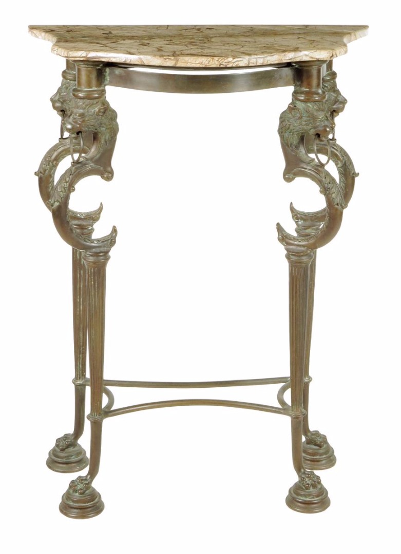 A bronze and marble console table in Regency style, the fixed top above four lion monopodia, 84.5cm high, 60.9cm wide, 30.6cm deep.
