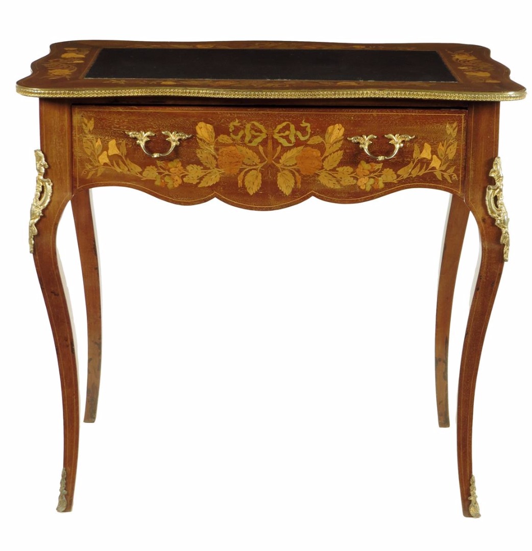 A late 19th century mahogany and floral marquetry writing table in Louis XV style