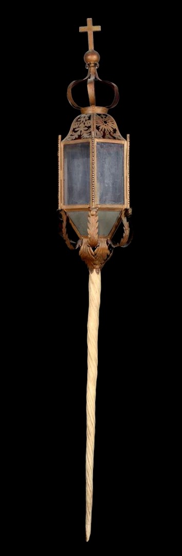 λ A late 19th century Italian narwhal tusk and gilt metal lantern, with an orb and cross finial above six glass panels, one with a hinged door above scroll leaf decoration, possibly Venetian, the lantern, 178cm high, the tusk approximately 103cm long.