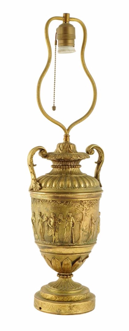A late 19th century ormolu vase table lamp, with leaf scroll handles, the body cast with classical figures, stamped with initials 'H.H.V.F.B', 60.6cm high, 16.5cm wide.