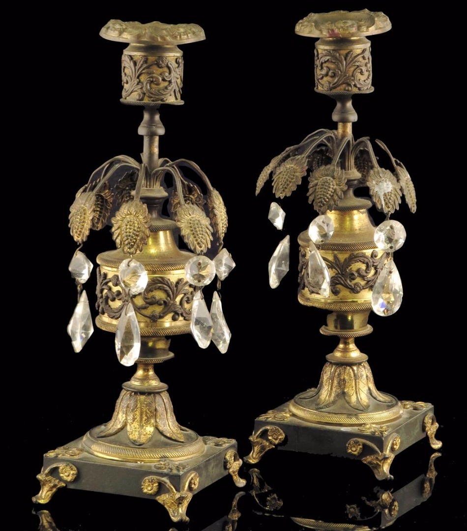 A pair of Regency gilt and patinated brass and bronze candlesticks, each decorated with scrolling leaves and flowers and hung with faceted lustres, on scroll feet, 27.5cm high. (2)