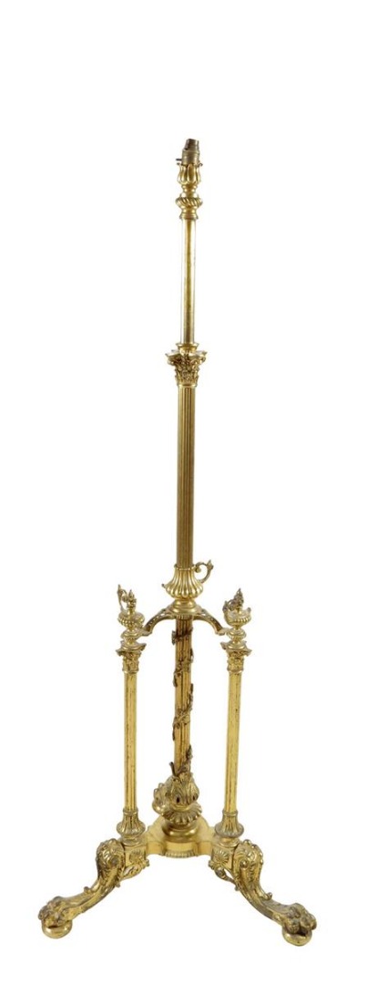A late Victorian gilt brass Corinthian column standard lamp, with fluted stems, the elaborate base with three flaming oil lamps with a grapevine entwined central stem, on leaf capped lion's paw feet, 147.8cm high, 55cm wide.