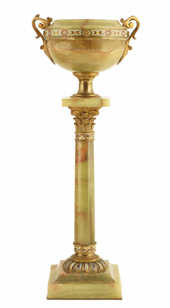 A late 19th century French onyx and champleve lamp, with gilt brass mounts, with a twin handled vase supported by a Corinthian column, originally an oil lamp but later converted for electricity, 76cm high.