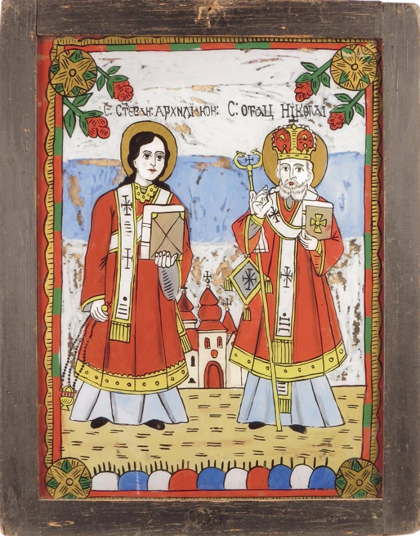 Four Eastern European Orthodox Church reverse glass paintings, two with the Madonna and Child, one with a bishop and a saint, the other with four saints, 51.2 x 38.5cm (max), Serbian, all framed. (4)