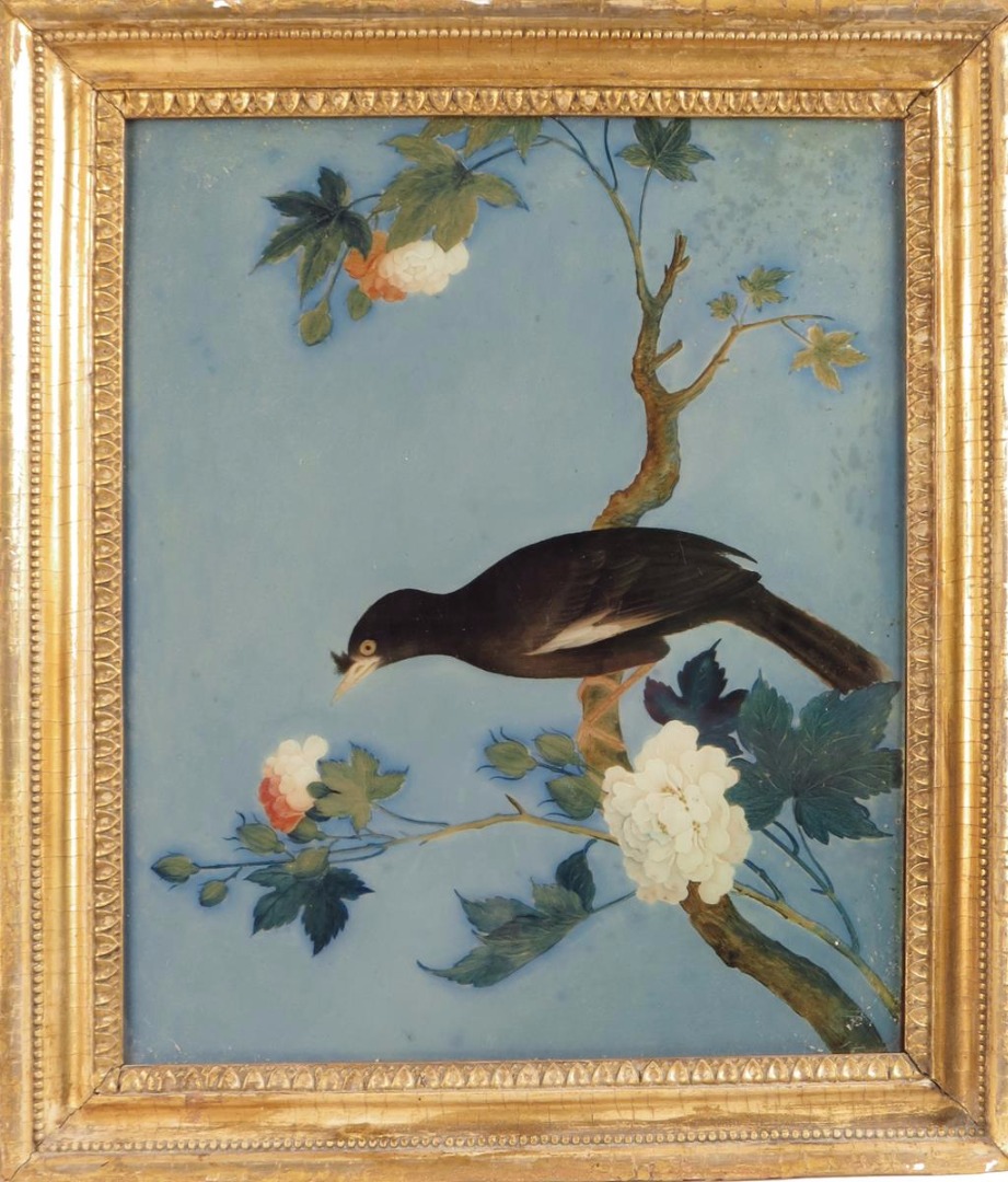 A Chinese reverse glass painting of a bird, perched on a branch, late 18th / early 19th century, 37 x 30.2cm, in a moulded giltwood frame.