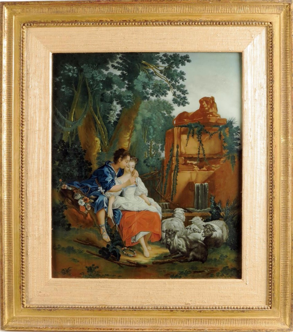 A fine late 18th century Chinese reverse glass painting of a shepherd and shepherdess
