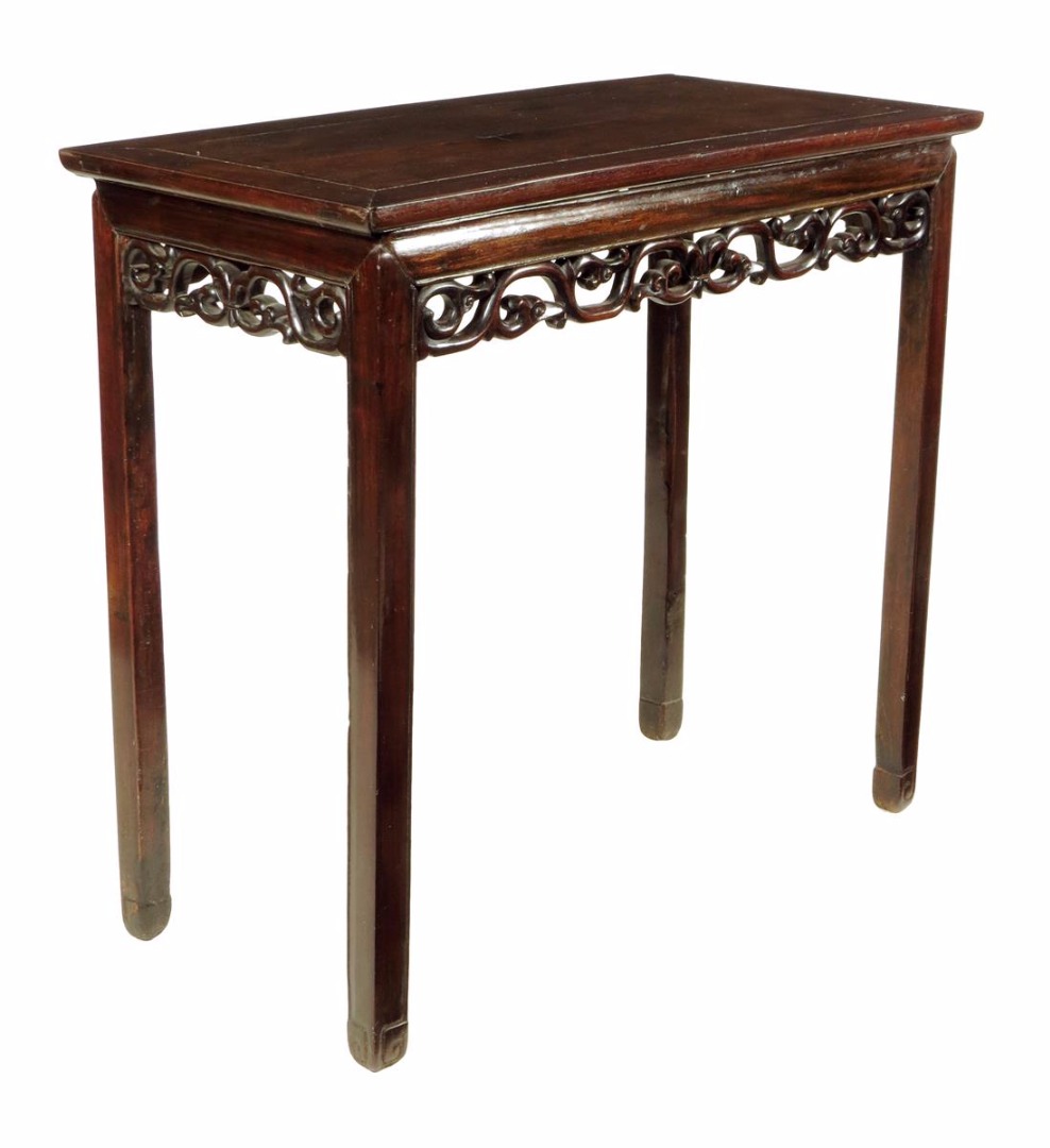 A Chinese hardwood side table, the panelled top above a pierced carved frieze on moulded legs and scroll feet, 87cm high, 92.6cm wide, 46.5cm deep.