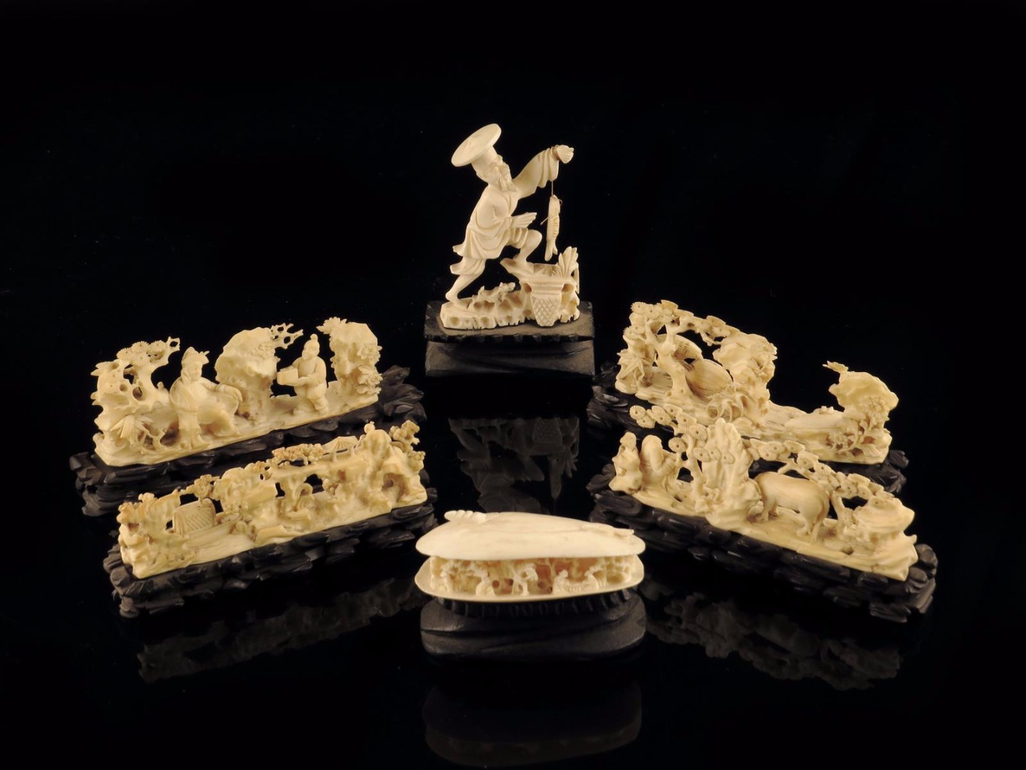 λ Four small 19th century Chinese ivory carvings, of figures in landscape settings, with trees, horses, boats, birds and rockwork, each on a carved hardwood base, 11.6cm wide, together with a carving of a fisherman on an ebonised plinth and a carved model of a clam shell the interior with figures and trees, on an ebonised base. (6)