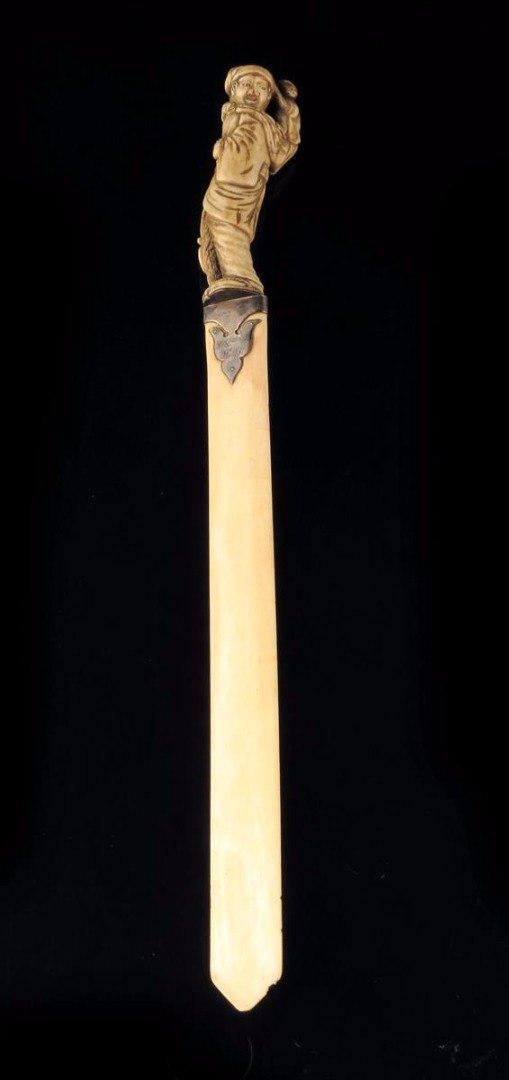 λ A late Victorian page turner, the carved bone handle in the form of a monkey catcher with the primate on his back, above a silver mount inscribed with initials 'G. H. from S. B.', hallmarked for London 1882, with an ivory blade, 43.5cm long.