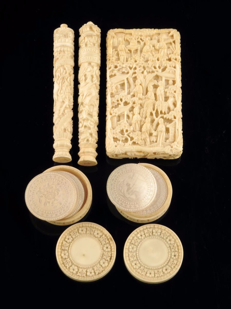 λ A Chinese carved ivory card case, decorated with figures, buildings and trees, two Chinese carved ivory needle cases and a pair of Chinese ivory counter boxes, each containing six engraved mother of pearl counters, all 19th century, 5.3cm high (max). (5)
