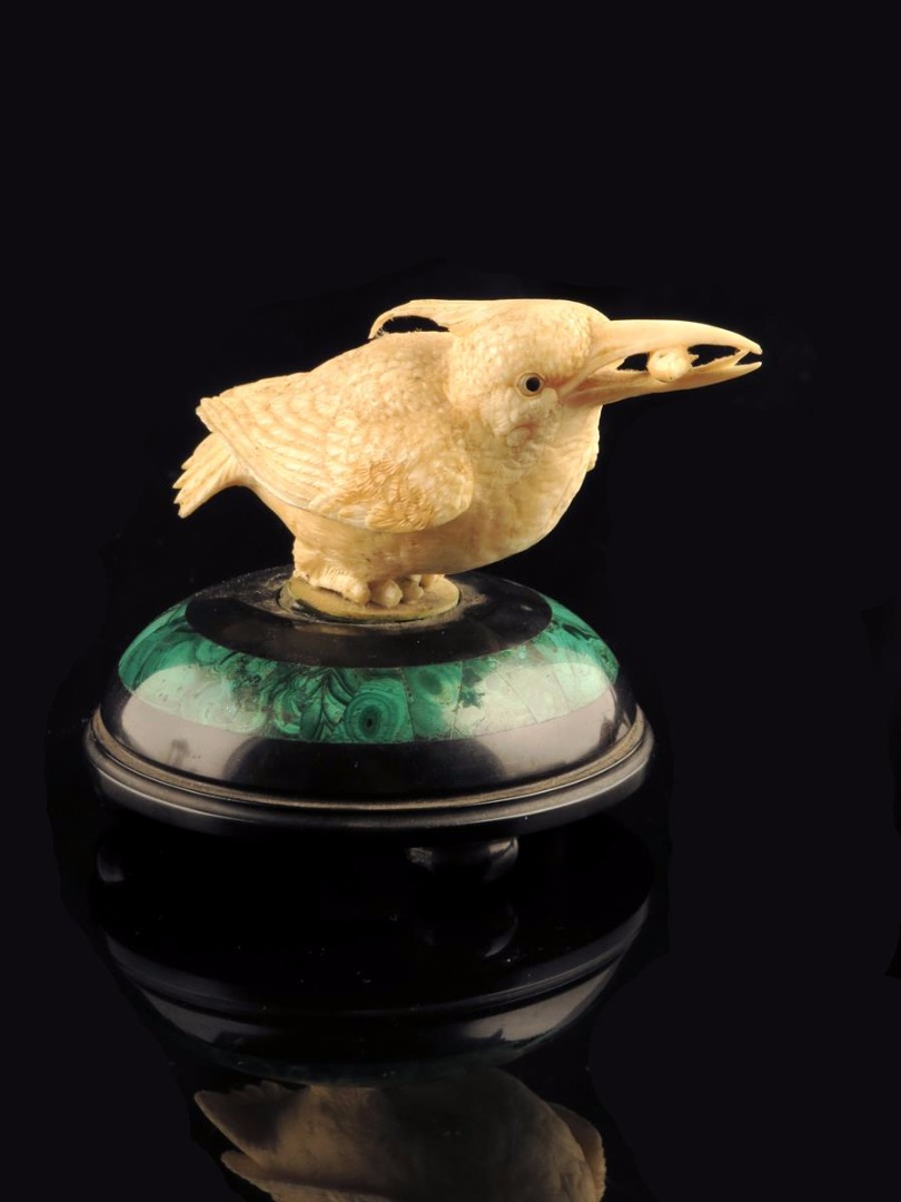 λ A Japanese carved ivory model of a kingfisher, with a fish in its beak, with mother of pearl and ebonised eyes, later mounted in a black marble and malachite base, Meiji 1868-1912, 7cm high.