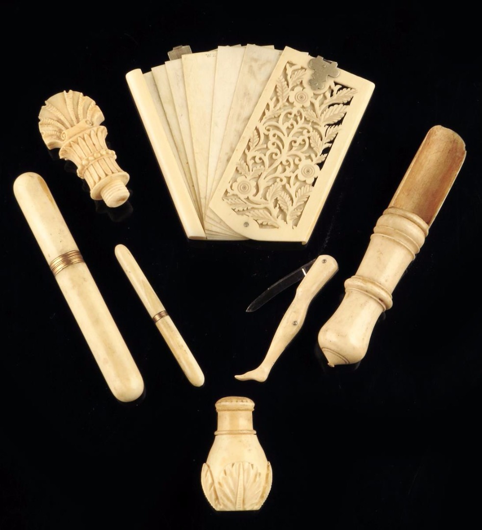 λ An ivory and gilt metal mounted needle case, together with a similar bodkin, both late 18th / early 19th century, a carved ivory sprinkler decorated with leaves, a card holder finial carved with shell scrolls, an aide-memoire with six tablets for the days of the week, a bone apple corer and a small penknife in the form of a leg, the steel blade stamped 'LONDON', 12cm long (max). (7)