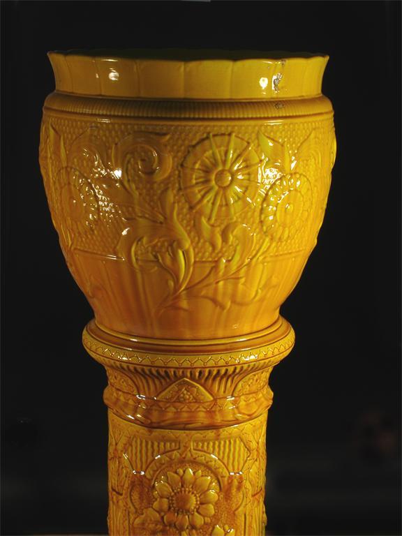 A Burmantoft's Faience jardiniere stand with matched bowl, modelled in low relief with flowers and foliage, glazed yellow impressed marks to the stand, stand 67cm. high