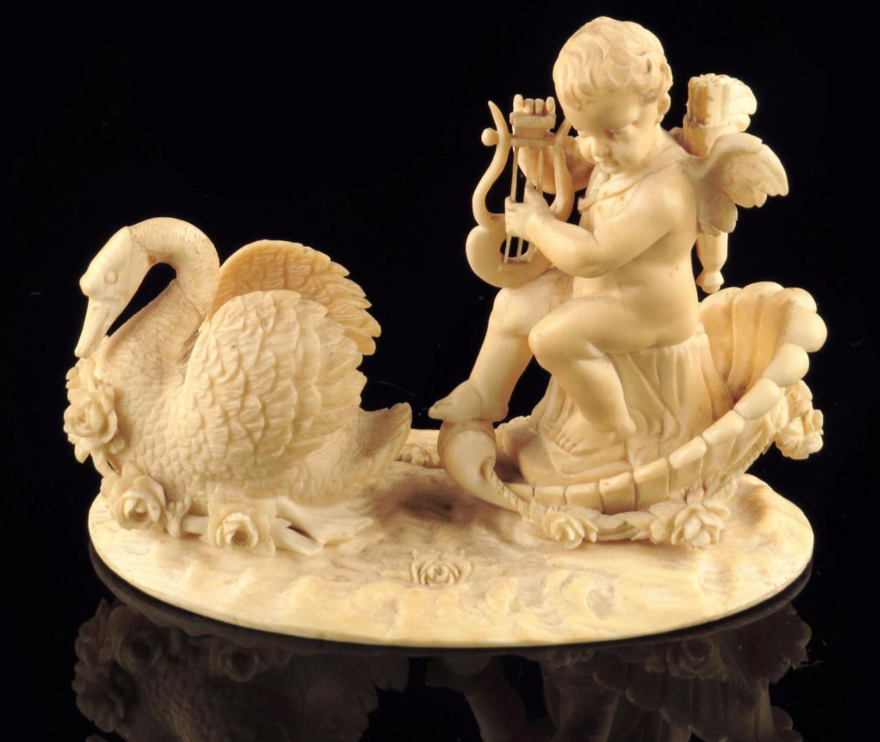λ A European carved ivory group of Cupid and a swan, seated in a flower festooned shell playing his lyre, drawn by a swan on a naturalistic sea base, possibly Dieppe, 18th / 19th century, 9.3cm high, 13.5cm wide.