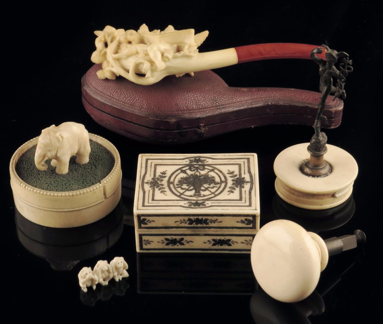 λ After Giambologna. A bronze model of Mercury, on an ivory base, an ivory box with a hinged lid, broken with engraved decoration of a basket of flowers and floral sprays, the interior with two lidded compartments, an ivory box and cover with a carved elephant finial on a shagreen ground, a turned ivory doorknob, a miniature carved ivory wise monkey group and a meerschaum pipe in a leather case, with retailers mark 'J.T. PRESTON 15 COLLEGE GREEN DUBLIN', late 18th century and later, 15.3cm long (max). (6)