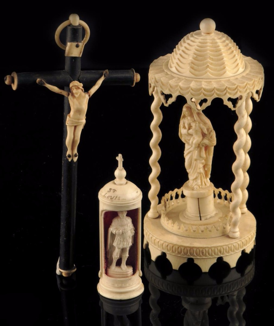 λ A 19th century European carved ivory group of the Madonna and child, standing on a plinth under a canopy / baldacchino with Solomonic columns, 14cm high, together with a carved bone figure of St Louis standing in a niche and a carved ivory / bone Corpus Christi on an ebonised cross. (3)