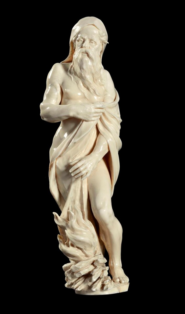 λ A German carved ivory figure of Winter, the old bearded man wearing a loose robe and warming himself near a fire, late 17th / early 18th century, 36.8cm high.
