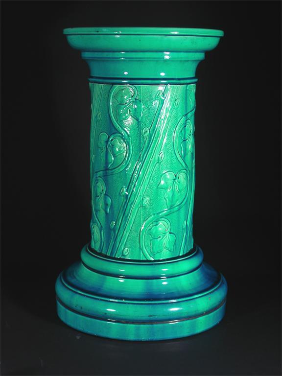 A Burmantoft's Faience jardiniere stand model 624, modelled in low relief with ivy trails, glazed blue impressed marks, glaze chips 61cm. high