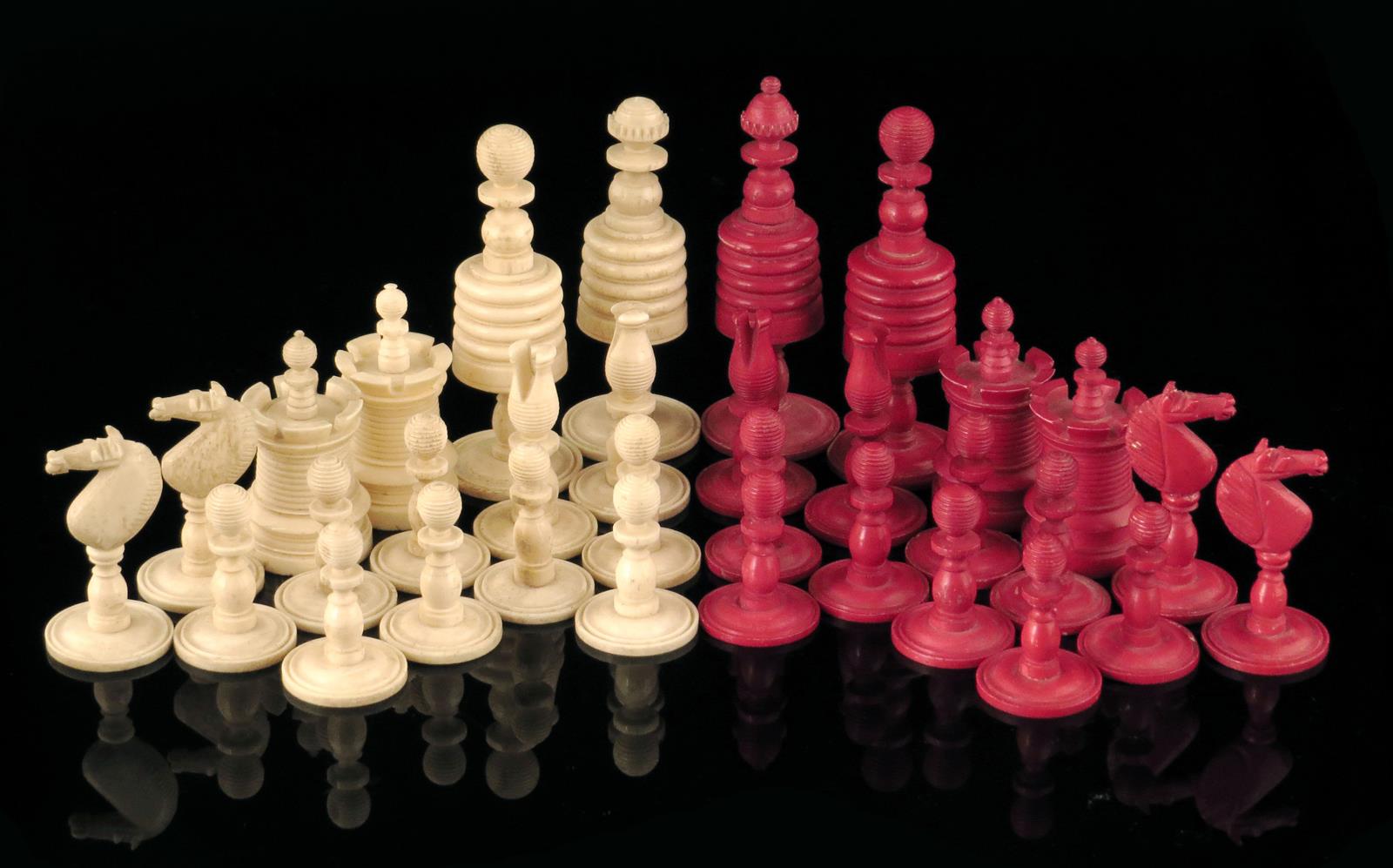 A 19th century turned bone chess set, natural and stained red, the king: 8.5cm high, the pawn: 3.4cm. (32)