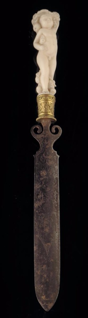 λ A continental ivory handled paper knife, the handle carved with a cherub possibly Bacchus with bunches of grapes and fruit, above a grapevine gilt collar and a damascened blade, late 18th / early 19th century, 21.7cm long.