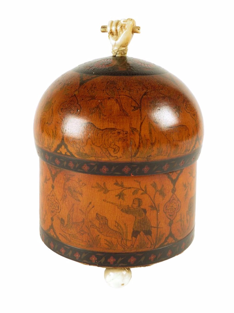 λ An Indian lacquer box, decorated with figures and a hunt scene with a carved ivory clenched fist finial on ball feet, late 19th / early 20th century, 17.9cm high.
