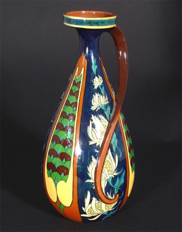 A Foley Intarsio vase designed by Frederick Rhead, with single scrolling handle, painted with floral panels printed marks, restored 31cm. high
