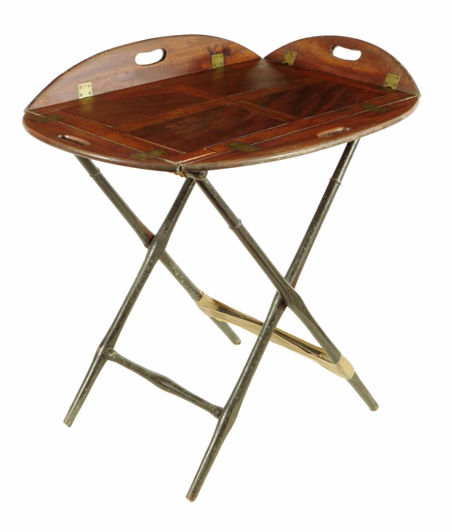 An early 19th century mahogany butler's tray, with folding sides, each pierced with a handgrip on an ebonised folding stand, 83.5cm high, 70.5cm wide, 50.8cm deep.
