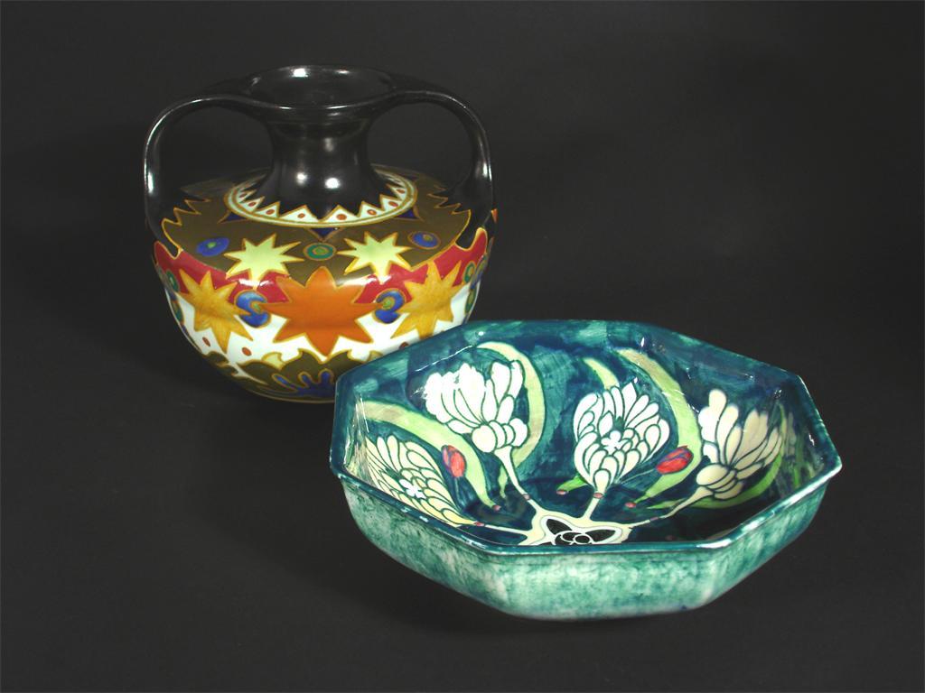 An Arnhem Astra pottery vase twin-handled form with painted star design, and a Grimwades Byzania pottery bowl printed and painted factory marks, small chip to handle 18cm. high