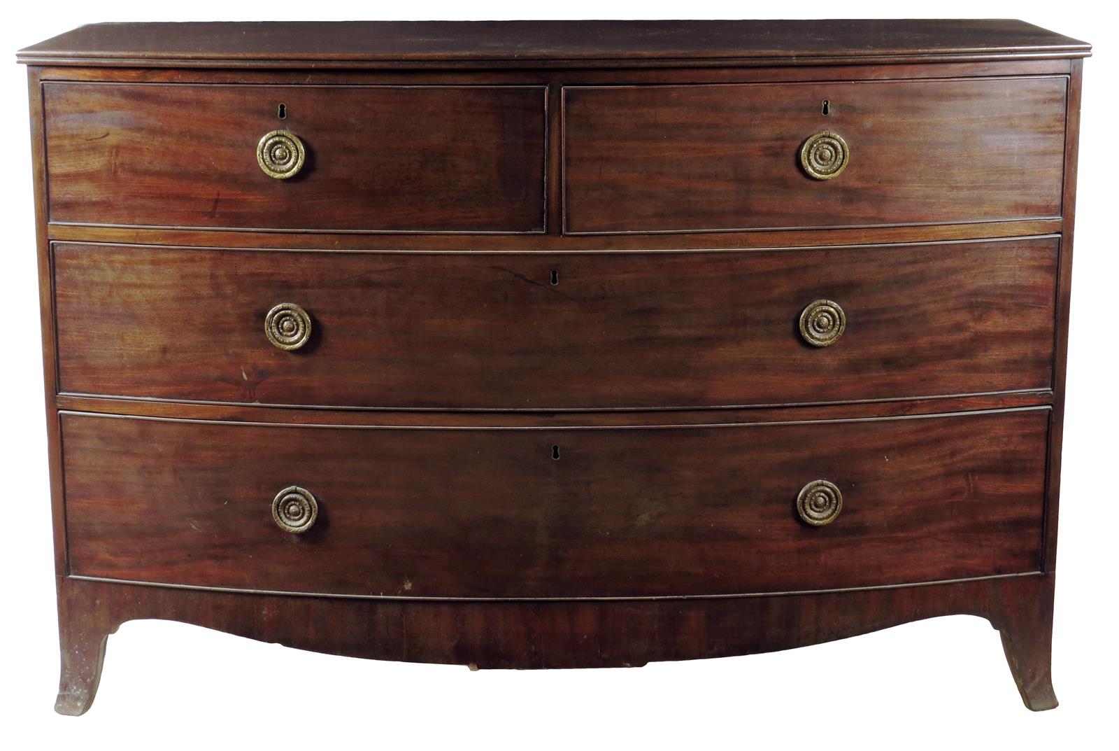A large Regency Irish mahogany bowfront chest, the top with a reeded edge above two short and two long drawers on French bracket feet, 98cm high, 150cm wide, 59.5cm deep