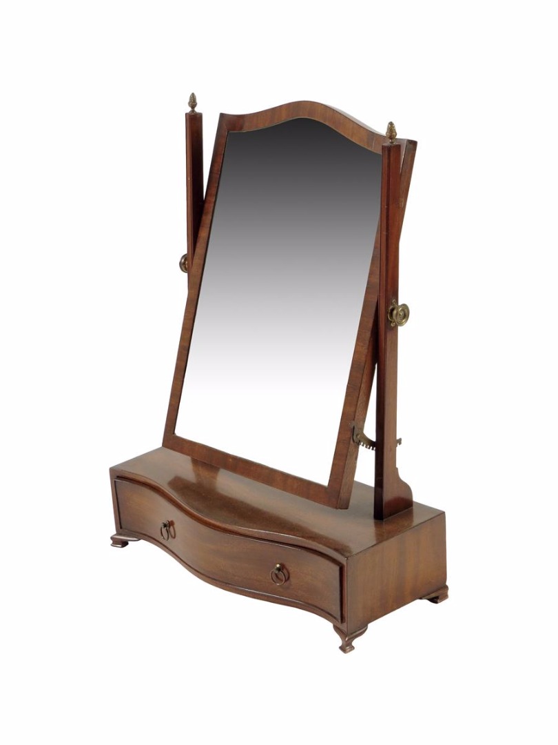 A mahogany dressing table mirror, with an arched plate on a later ratchet mechanism above a serpentine box base, 60.5cm high, 45cm wide, 19cm deep.