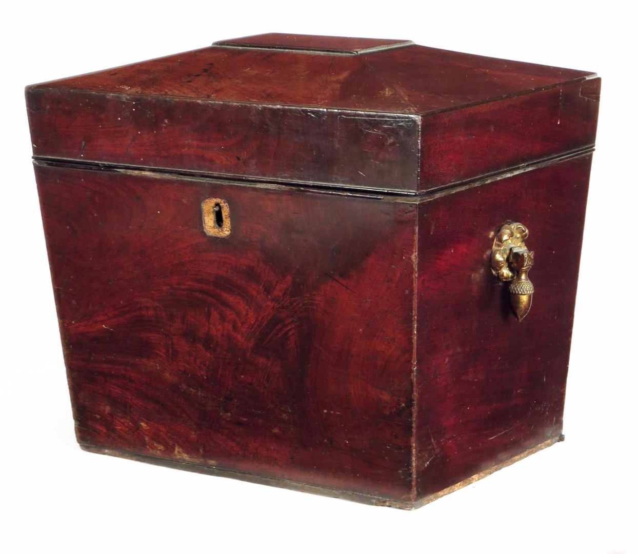 A William IV mahogany sarcophagus shape wine cooler, the lead lined interior with six divisions with gilt brass acorn and rosette side carrying handles, 35.4cm high, 40cm wide, 28cm deep.