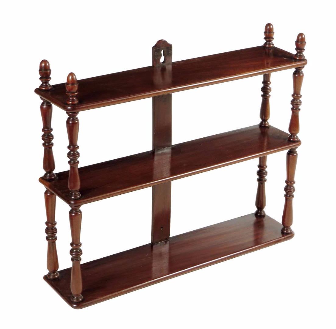 A set of Victorian mahogany hanging wall shelves, with acorn finials and ring turned baluster supports, 56.2cm high, 67.8cm wide, 16cm deep.