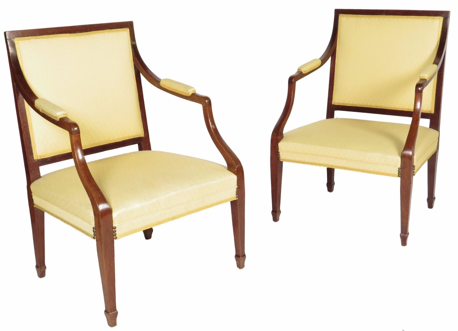 A pair of mahogany open armchairs, each with a padded back, armrests and seat, on square tapering legs, early 19th century and later. (2)