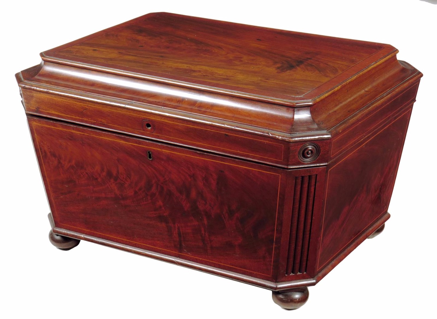 A Regency mahogany sarcophagus shape wine cooler, inlaid with stringing, the interior with divisions for twelve bottles, on bun feet with sunken castors, possibly Irish, 42.2cm high, 69.3cm wide, 55cm deep.