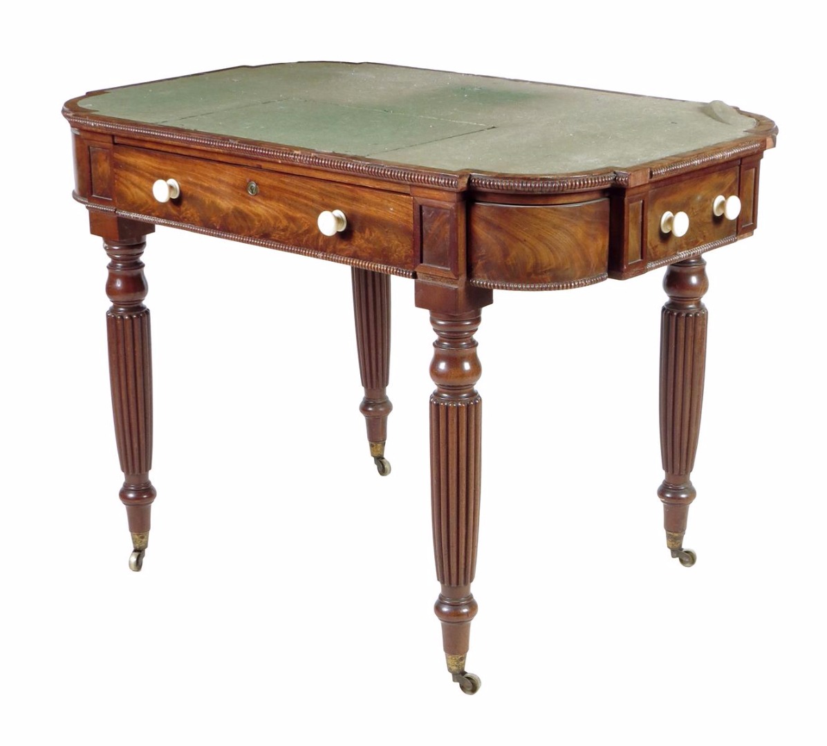 λ A George IV mahogany writing table in the manner of Gillows, the breakfront top inset with green material and with a hinged slope on a ratchet above a frieze drawer with ivory knob handles, the frieze with three further false fronts and nulled moundings, on turned and ribbed tapering legs and brass castors, 74.8cm high, 107.6cm wide, 67cm deep.