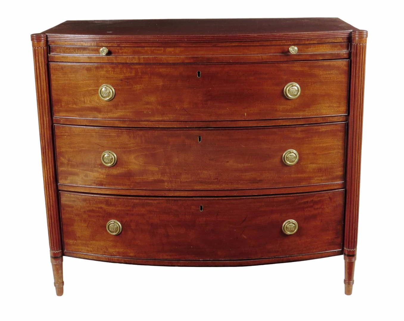 A Regency mahogany bowfront chest, the top with a reeded edge above a baize lined brushing slide above three long drawers flanked by ribbed columns, 91.4cm high, 106cm wide, 53.8cm deep.