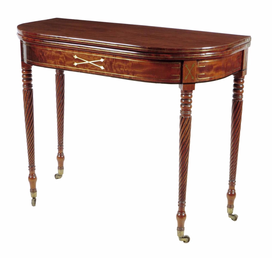 A Regency mahogany and brass inlaid 'D' shape tea table, on turned and spiral twist tapering legs and brass castors, possibly Scottish, 74.4cm high, 90.5cm wide, 43.7cm deep.