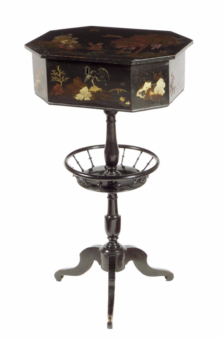 An early 19th century black japanned sewing table, decorated with chinoiserie with figures, trees and birds, the hinged lid revealing a divided interior above a turned stem with a galleried undertier, 75cm high, 41.5cm wide, 35.5cm deep.