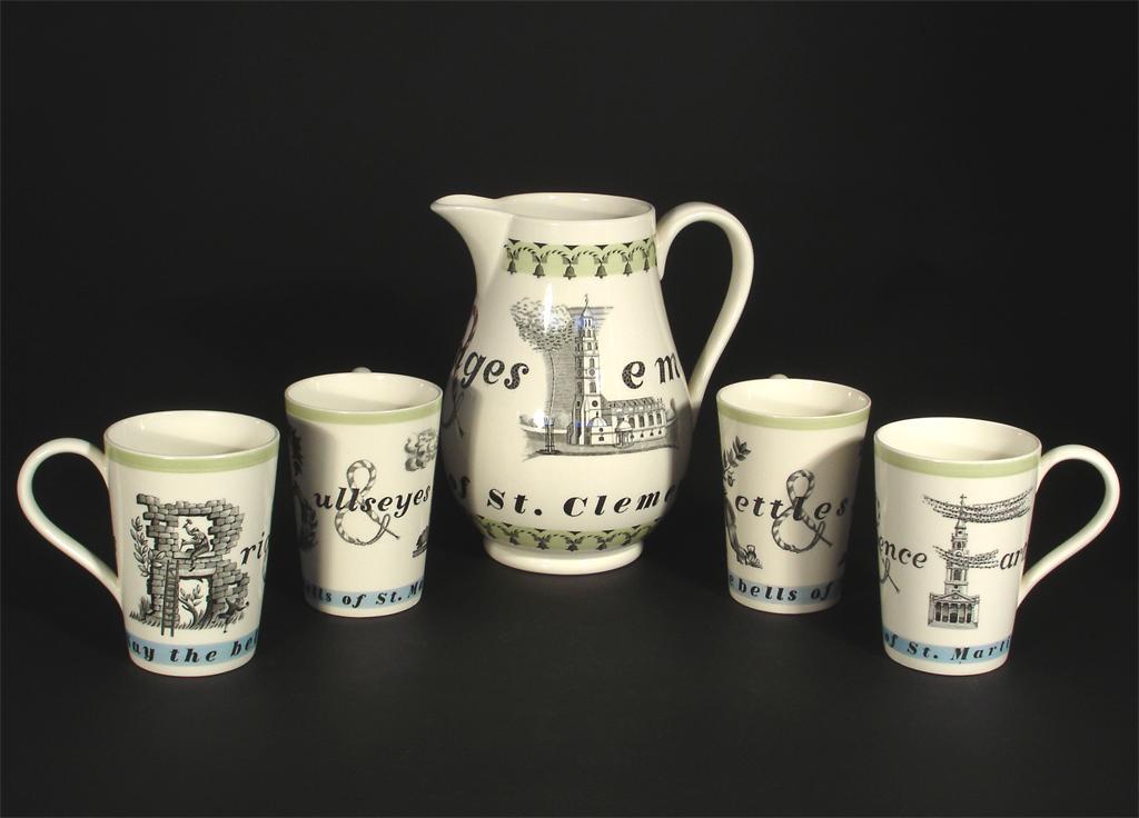 'Oranges and Lemons' a Wedgwood Lemonade jug and four beakers designed by Richard Guyatt, made for Liberty's printed with the songs churches, in colours printed marks, small chip to base rim of one beaker, jug 19cm. high
