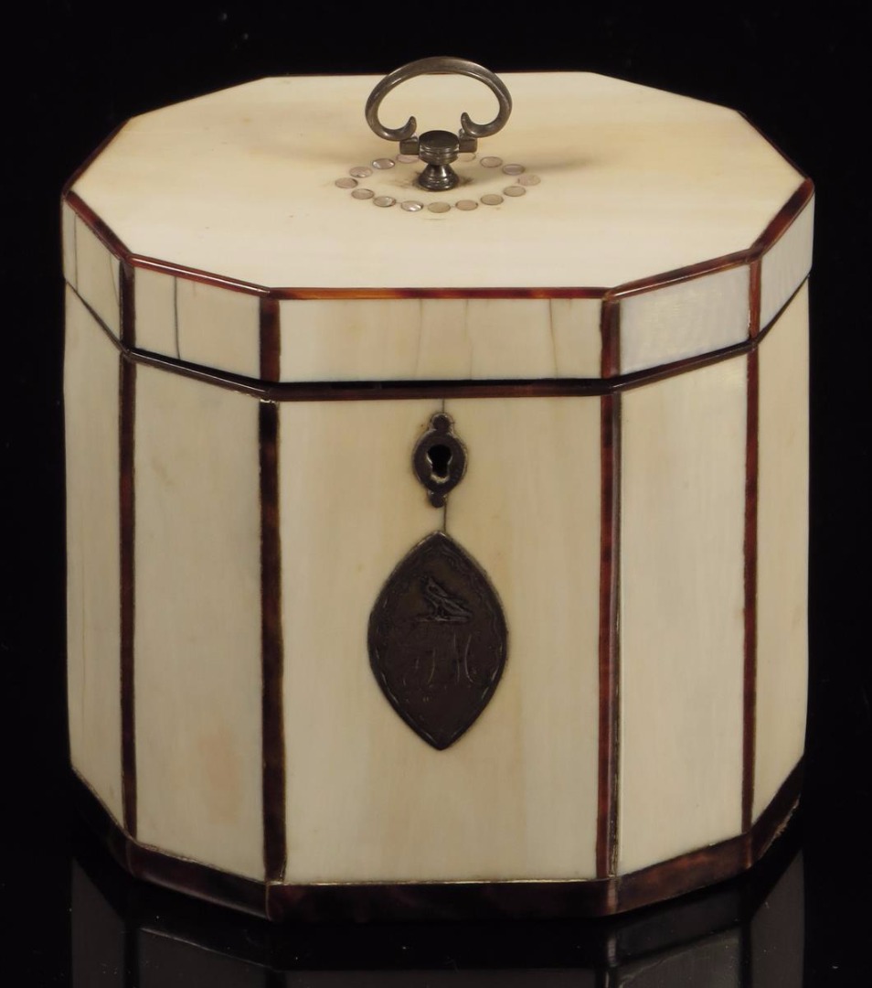 λ A George III ivory decagonal tea caddy, inlaid with tortoiseshell stringing, the front with a navette shape escutcheon engraved with a bird over initials 'GSM', the hinged lid with mother of pearl dot inlay and a swing handle revealing a lidded interior, 10.8cm high, 10.5cm wide.
